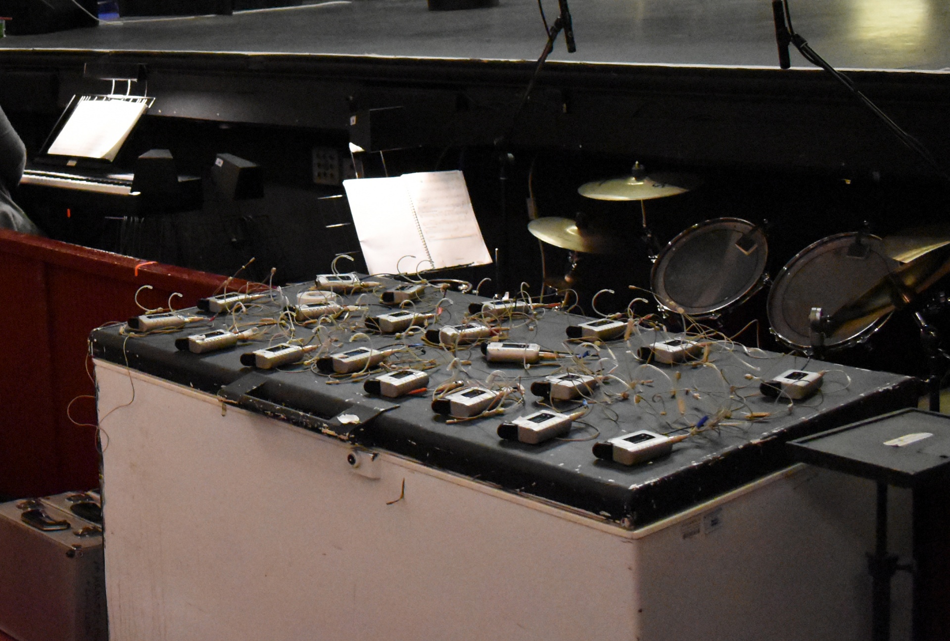 Microphone packs at the ready. Every cast member is mic'd up for the show.